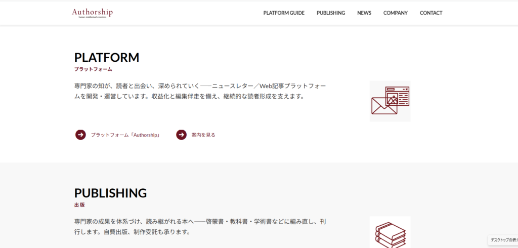 弊社ホームページをリニューアル 2025/12/14 最終更新日時 : 2026/04/05 Authorship_vektor 弊社ホームページをリニューアル 弊社は、専門家や組織が持つ知を、受け手にきちんと届くかたちへ整え、ウェブ発信・出版へとつなげるまでを支援いたします。 ニュースレター/記事発信プラットフォーム 専門家や組織が、ニュースレター/記事を配信し、読者とつながる基盤を提供します。発信を継続し、関係を構築したい方に。 出版 書籍や広報誌など、読み手に届く一冊にまとめます。企画から編集・制作・刊行まで対応します。 ご要望に合わせて無理のない進め方をご提案いたします。